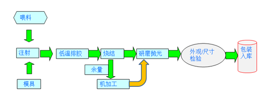 首先,選取符合CIM要求的陶瓷粉末與有機(jī)粘結(jié)劑,在一定溫度條件下,采用適當(dāng)?shù)姆椒ɑ旌铣删鶆虻奈沽?,然后,?jīng)制粒后在加熱塑化狀態(tài)下,用注射成形機(jī)注入模具型腔內(nèi)獲得成形坯,再經(jīng)過(guò)化學(xué)或溶劑萃取的方法脫脂處理,最后經(jīng)燒結(jié)致密化得到最終產(chǎn)品。